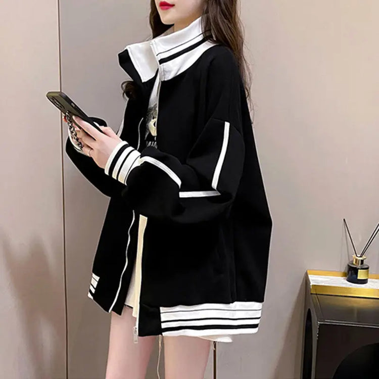 Female Clothes Black Sweatshirts for Women Full Zip Up Tops with Zipper Coat Striped Y2k Hoodie 2000s Long Sleeve Style Matching
