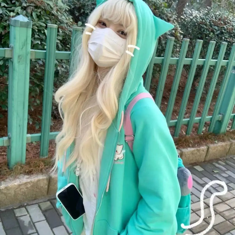 Lake Green Embroidery Cat Zipper Coats Women Loose Sweatshirts Japanese Long Sleeve Cute Sweet Ear Hooded Sudaderas Y2k Harajuku