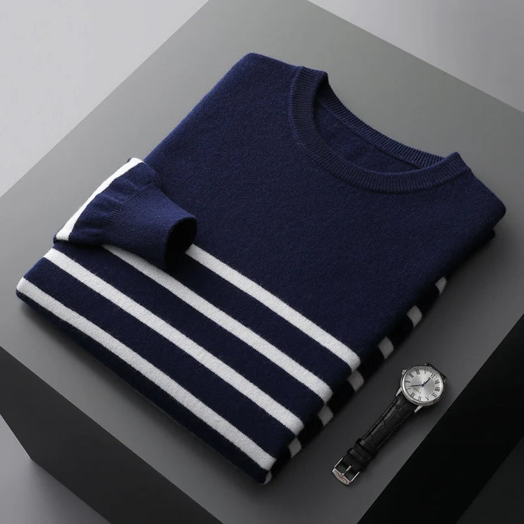 Men's New 100% Pure Wool Sweater O-neck Navy Style Striped Top Spring and Autumn Loose Youth Business Casual Cashmere Sweater