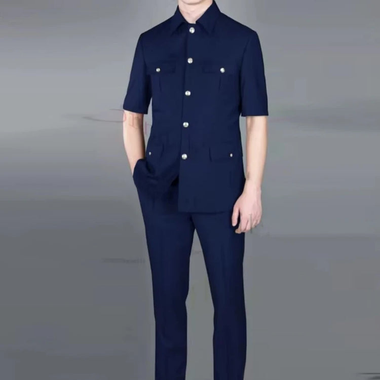 Short Sleeve Gold Button Slim Fit Party Coat Pant Suits Men Closure Collar Business Navy Blue Suits for Men MS579